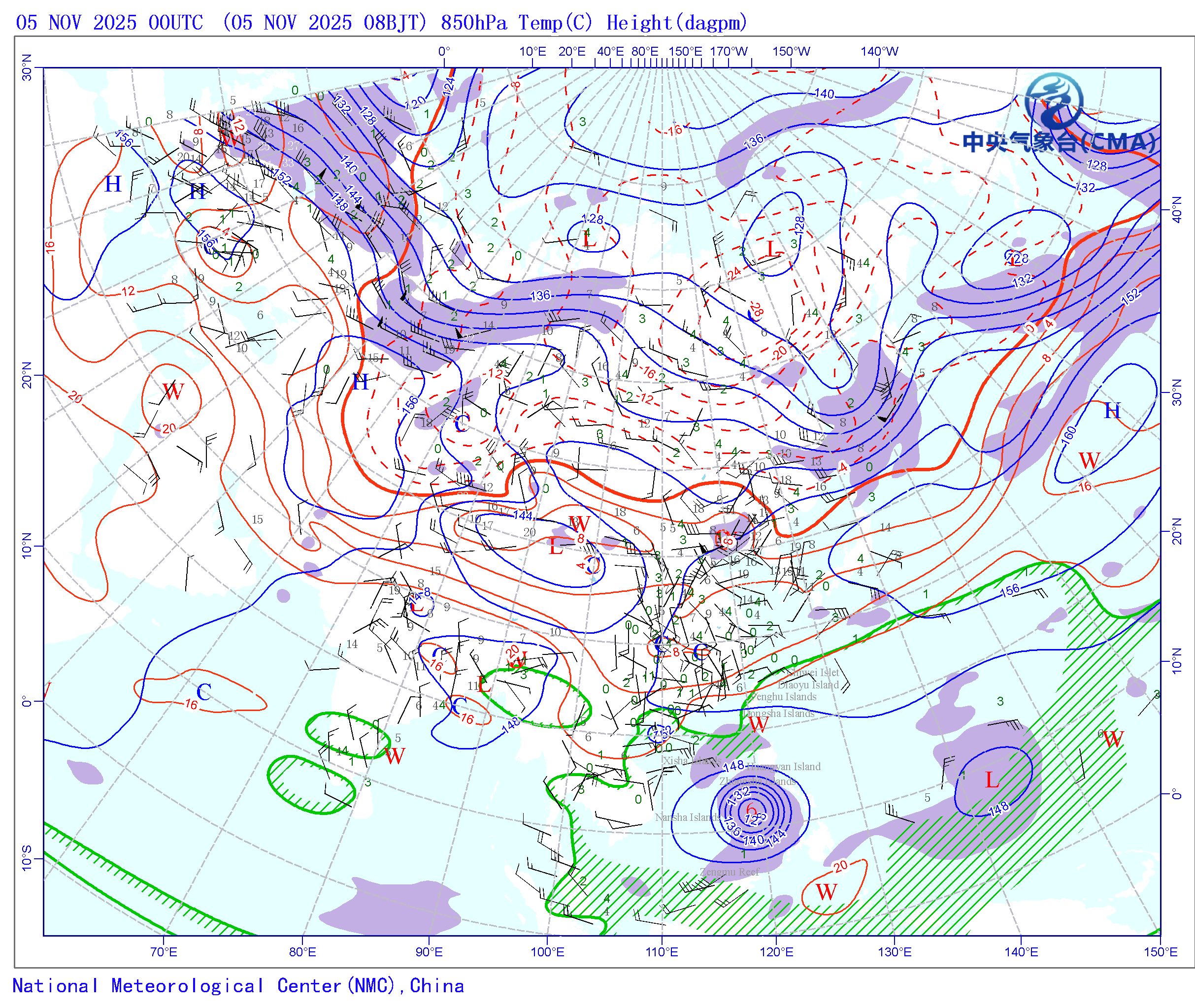 站點的填圖要素包括:風向風速和溫度露點差;天氣系統符號包括:高壓中心(H)、低壓中心(L)、暖中心(W)、冷中心(C)和臺風符號;藍色等值線為等高線(單位dagpm);紅色等值線為等溫線(單位℃),其中零攝氏度以下以虛線顯示;紫色填充區為風速達12m/s的急流區;綠色線條為等比濕線,其柵格化一側為比濕達到12g/kg的區域;