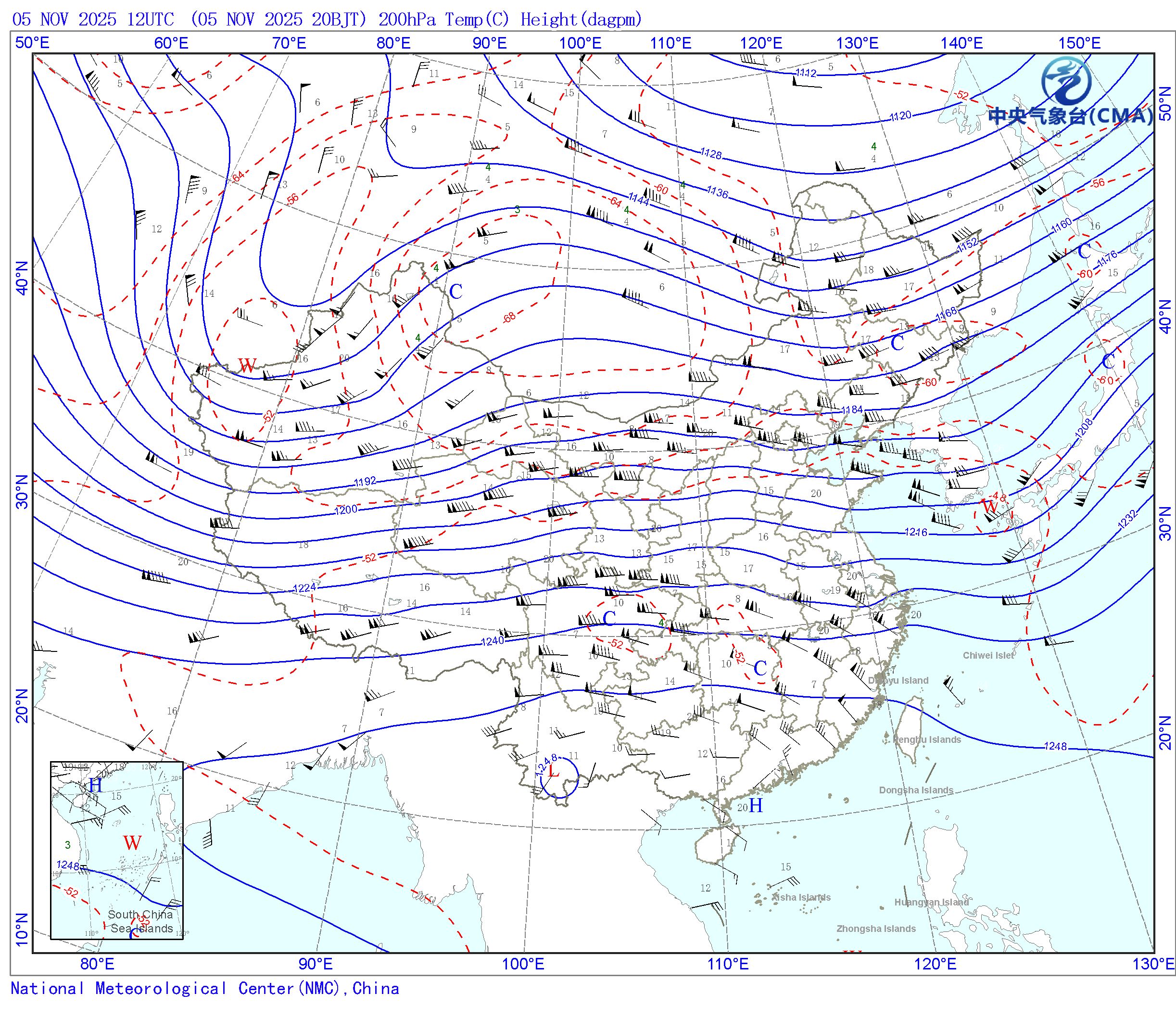 站點的填圖要素包括:風向風速和溫度露點差;天氣系統符號包括:高壓中心(H)、低壓中心(L)、暖中心(W)、冷中心(C)和臺風符號;藍色等值線為等高線(單位dagpm);紅色等值線為等溫線(單位℃),其中零攝氏度以下以虛線顯示。