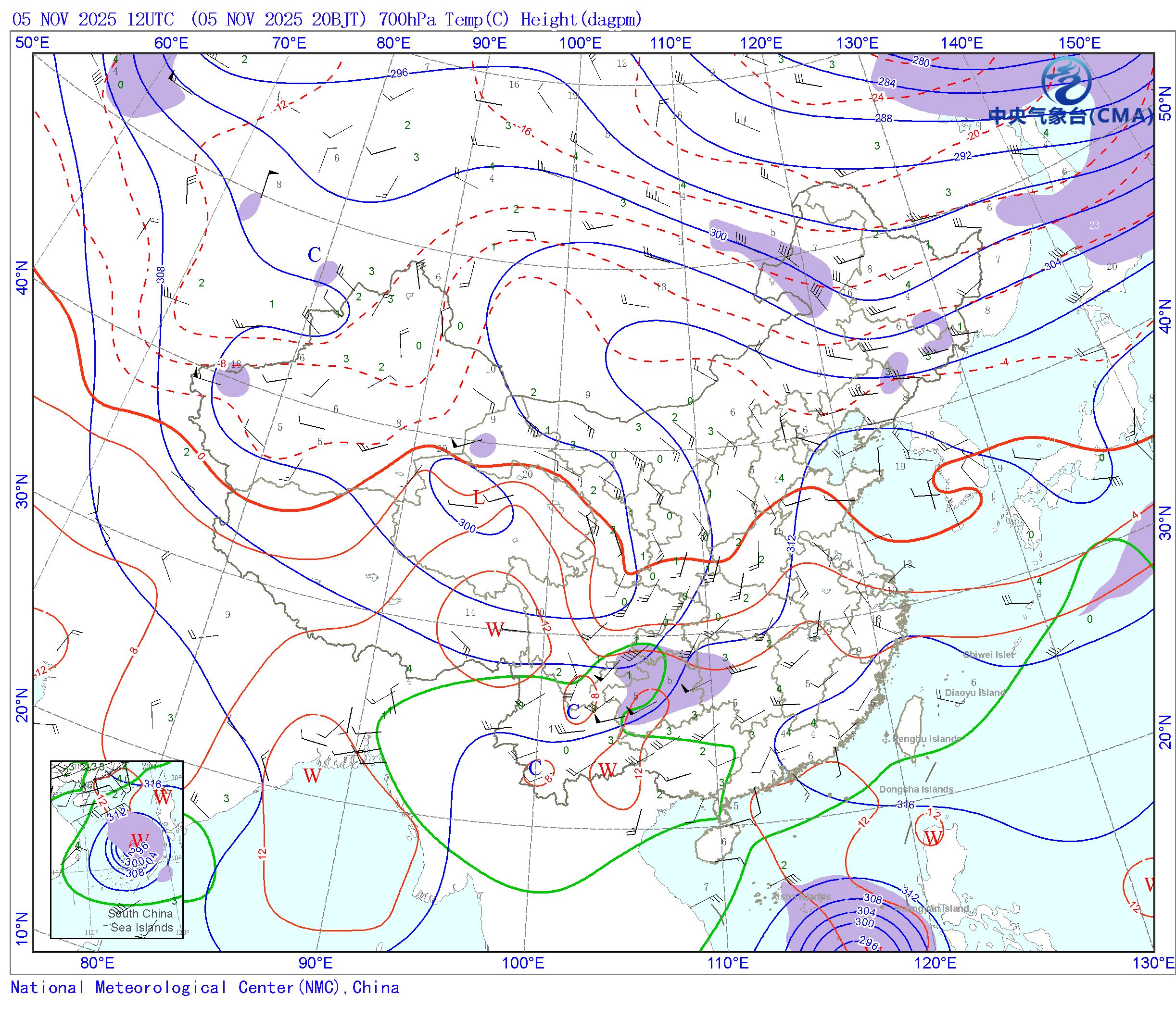 站點的填圖要素包括:風向風速和溫度露點差;天氣系統符號包括:高壓中心(H)、低壓中心(L)、暖中心(W)、冷中心(C)、槽線或切變線(棕色線段)和臺風符號;藍色等值線為等高線(單位dagpm);紅色等值線為等溫線(單位℃),其中零攝氏度以下以虛線顯示。紫色填充區為風速達16m/s的急流區;綠色線條為等比濕線,其柵格化一側為比濕達到9g/kg的區域;