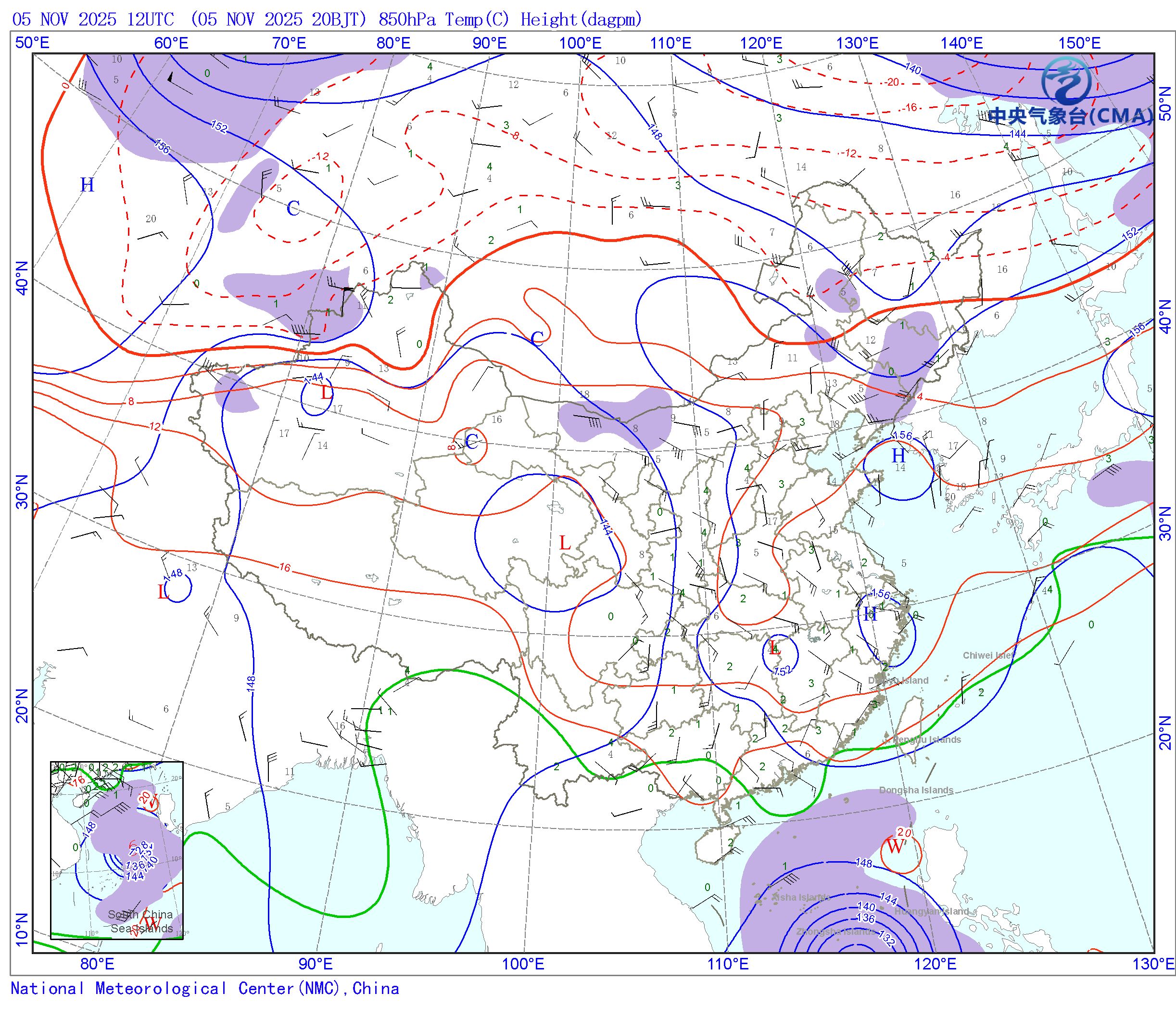 站點的填圖要素包括:風向風速和溫度露點差;天氣系統符號包括:高壓中心(H)、低壓中心(L)、暖中心(W)、冷中心(C)、槽線或切變線(棕色線段)和臺風符號;藍色等值線為等高線(單位dagpm);紅色等值線為等溫線(單位℃),其中零攝氏度以下以虛線顯示;紫色填充區為風速達12m/s的急流區;綠色線條為等比濕線,其柵格化一側為比濕達到12g/kg的區域;